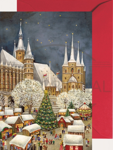 Das liebevoll gemalte Motiv des Erfurter Domes St. Marien und der St. Severinkirche stammt von einer Dame, die gern in ihrer Freizeit malte. Es hat den Charme des Stils der naiven Malerei. Deshalb fühlt man sich sofort in seine Kindheit zurückversetzt und es kommen die Kindheitserinnerungen früherer Jahre. Unser Miniadventskalender von Erfurt lässt erahnen, wie wundervoll die mittelalterliche Landeshauptstadt von Thüringen sich in Wirklichkeit zeigt. Erfurt gilt als das größte Flächendenkmal Deutschlands und die größte freischwingende Glocke der Welt im Turm des Erfurter Domes ist eine der vielen Sehenswürdigkeiten Erfurts. Schicken Sie unsere Adventskalendergrußkarte all ihren Freunden und locken Sie sie damit nach Erfurt.