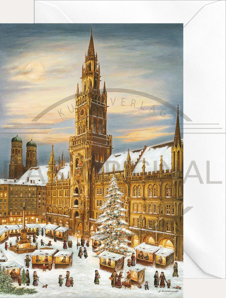 Die Weihnachtsklappkarte mit dem neuen Münchner Rathaus und dem Weihnachtsmarkt auf dem Marienplatz ist gut geeignet, an Freunde, Geschäftspartner und die Familie mit allen guten Wünschen zum Jahreswechsel, geschickt zu werden.