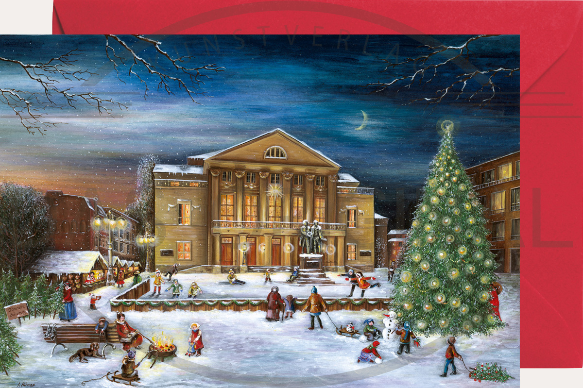 Der Miniadventskalender Weimar ist der kleine Bruder vom großen Adventskalender Weimar. Auf diesem Miniadventskalender ist das Deutsche Nationaltheater mit dem Denkmal von Goethe und Schiller zu sehen. Der Theaterplatz Weimar wird in der Weihnachtszeit zu einer Eisbahn verwandelt, umrahmt wird diese mit dem Weimarer Weihnachtsmarkt. Versenden Sie diesen schönen Miniadventskalender Weimar im Kartenformat, an Ihre Familie, Freunde oder auch Geschäftspartner. Mit dem passenden Umschlag lässt sich dieser wunderbar verschicken.